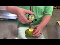 The sharpened blade cuts the fruit peel quickly and efficiently.